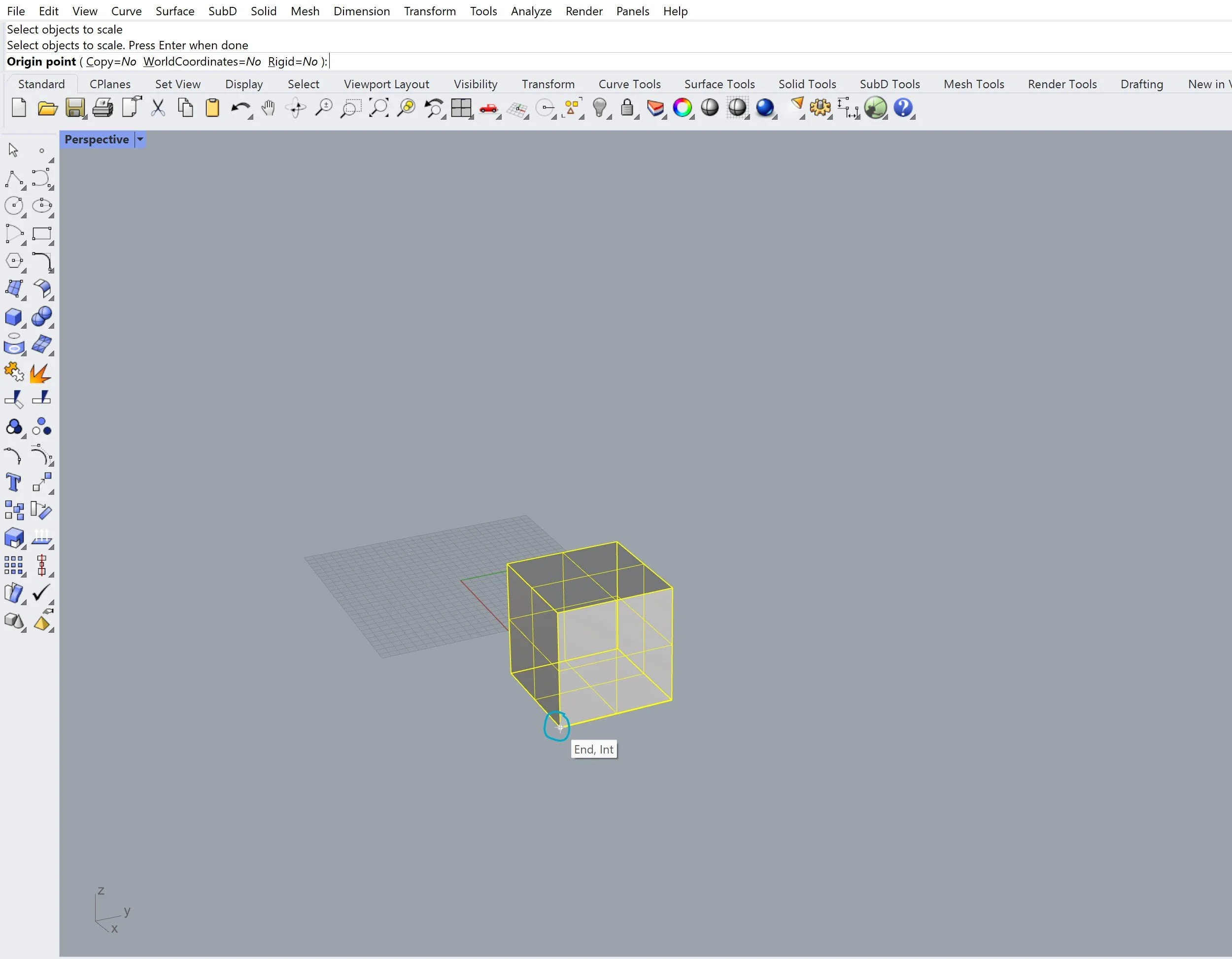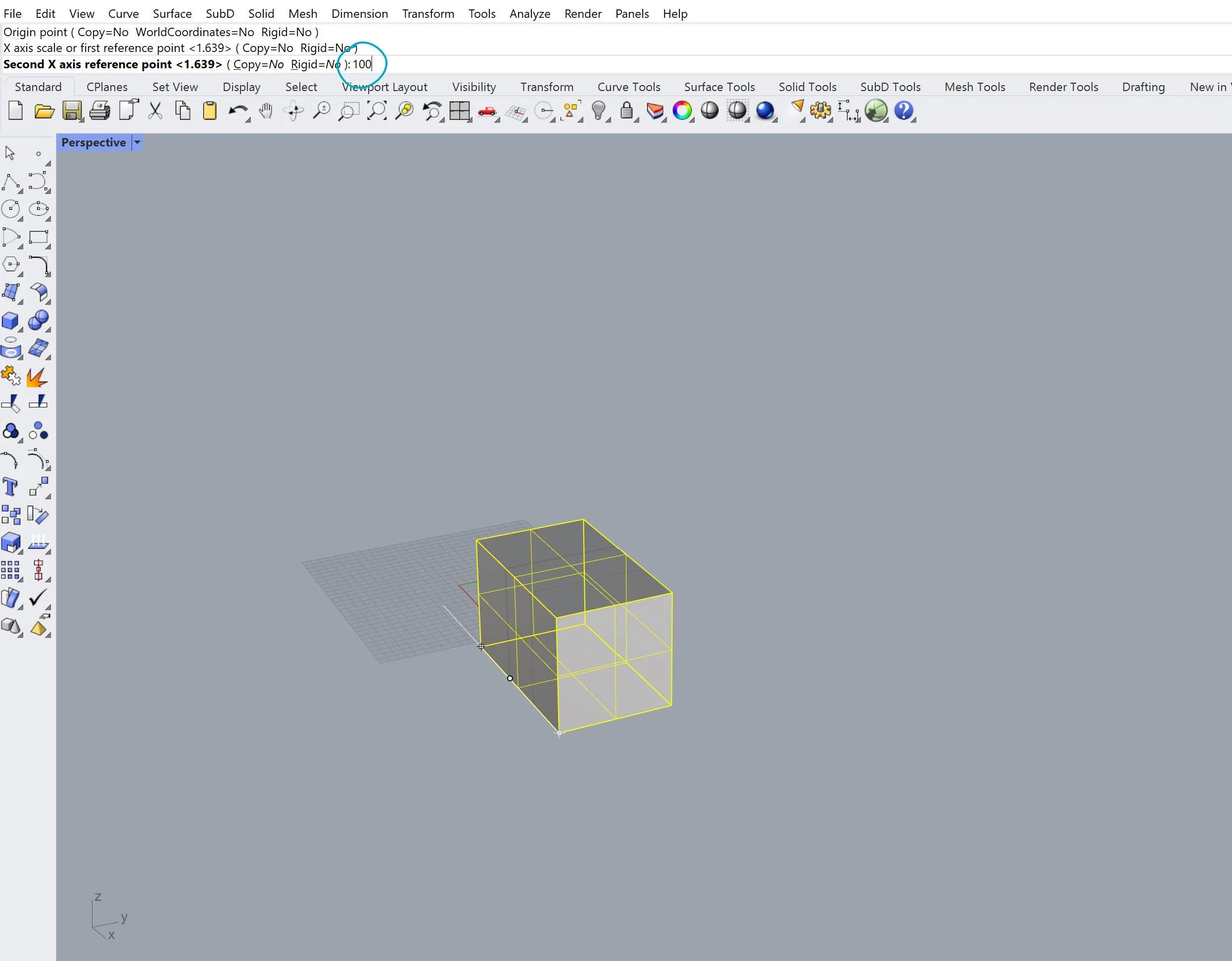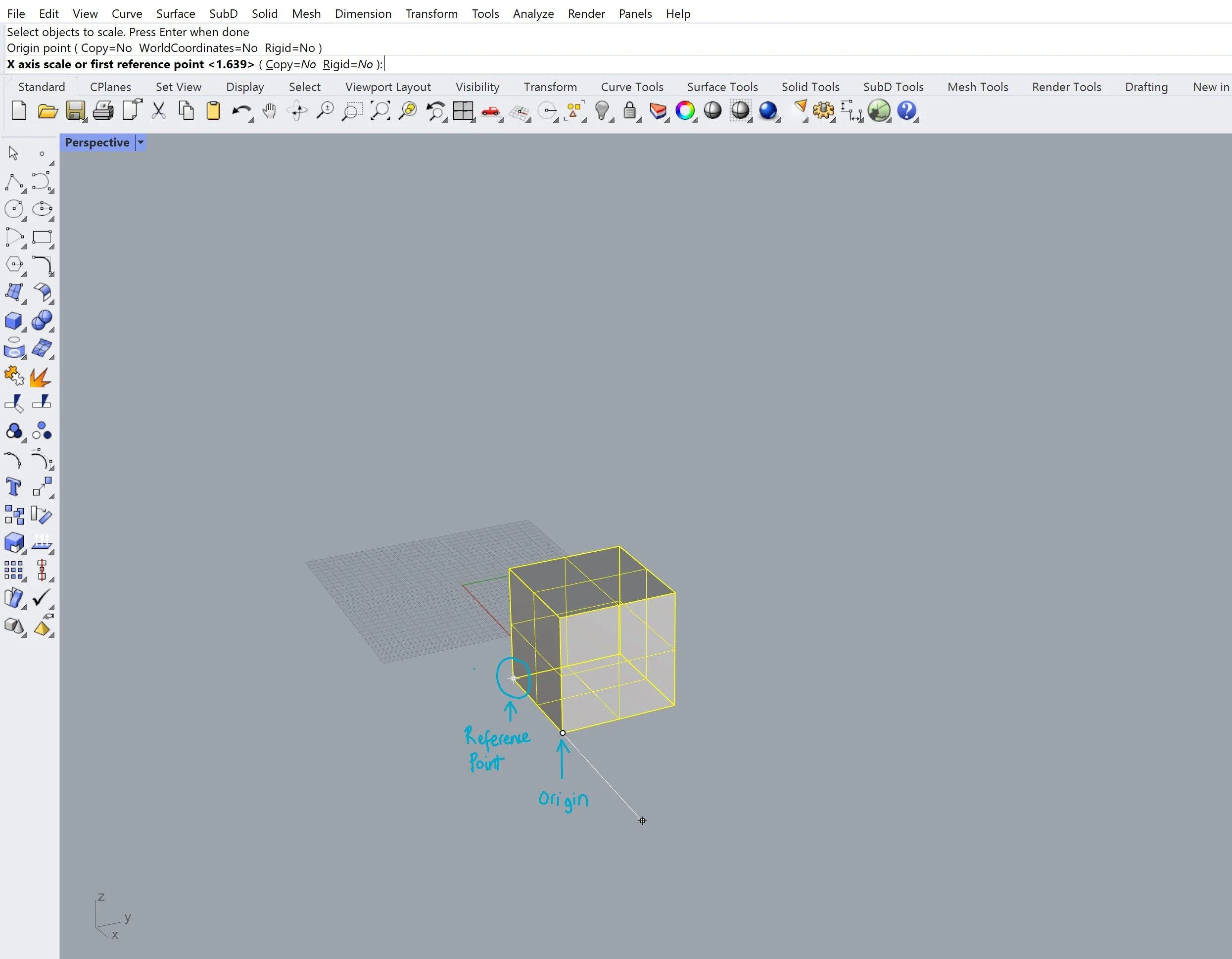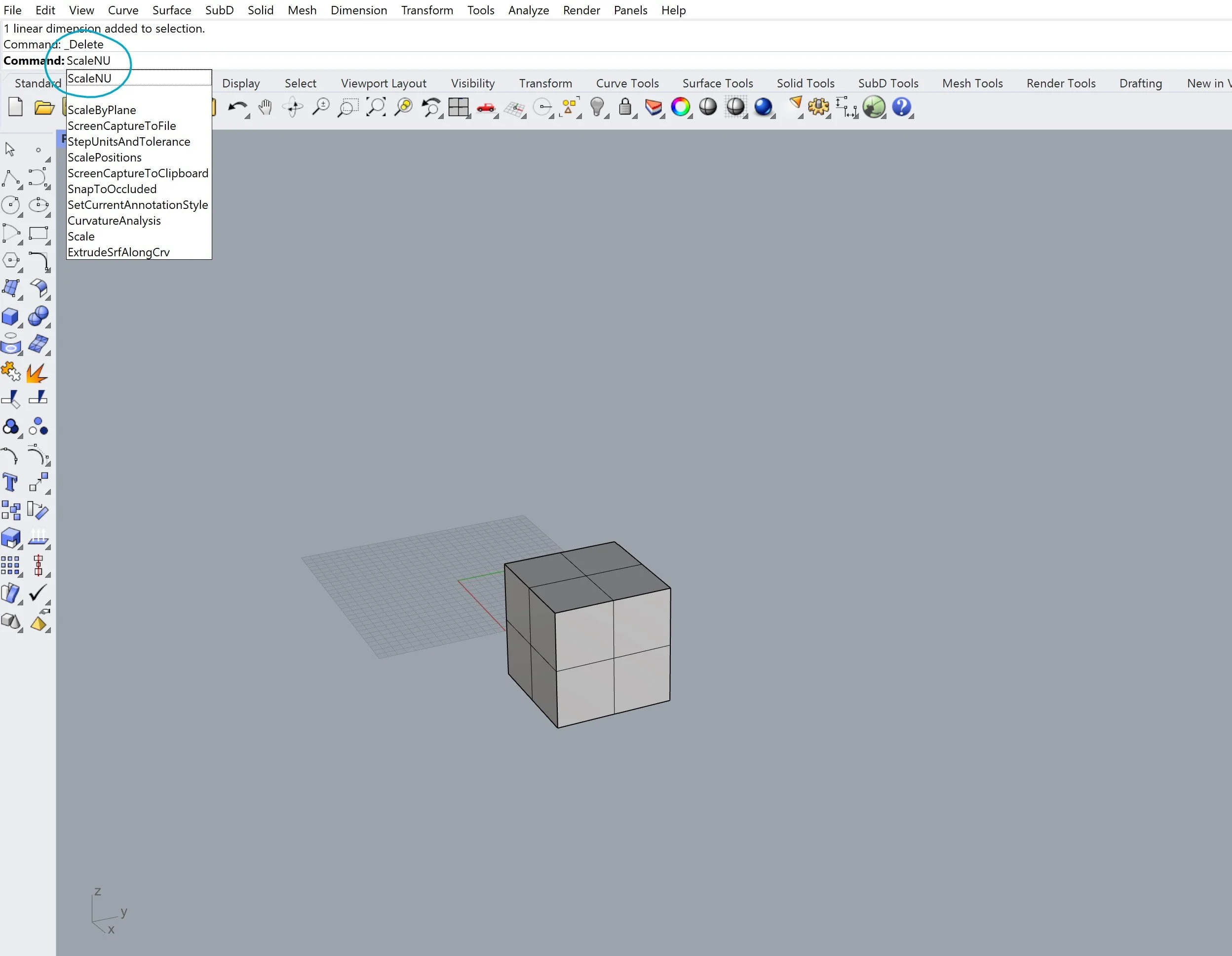 With the command ‘ScaleNU’, you can scale an object across all three planes with different scale factors and therefore you are no longer limited to only scaling an object by one factor in all three dimensions. For example, if you have a cube which reads 60mm x 60mm x 60mm but you want it to become a cuboid that is 100mm x 200mm x 50mm, you can use the ‘ScaleNU’ command.