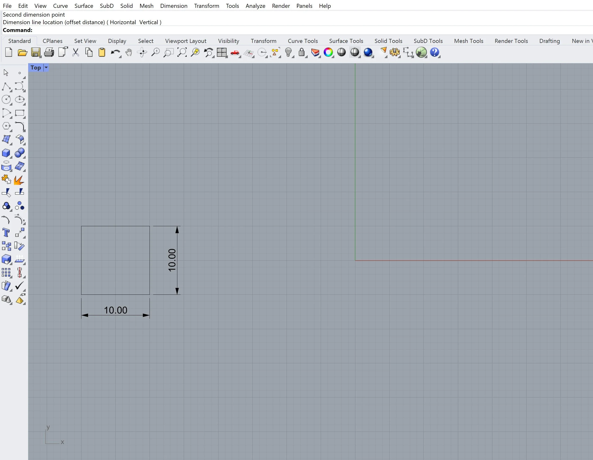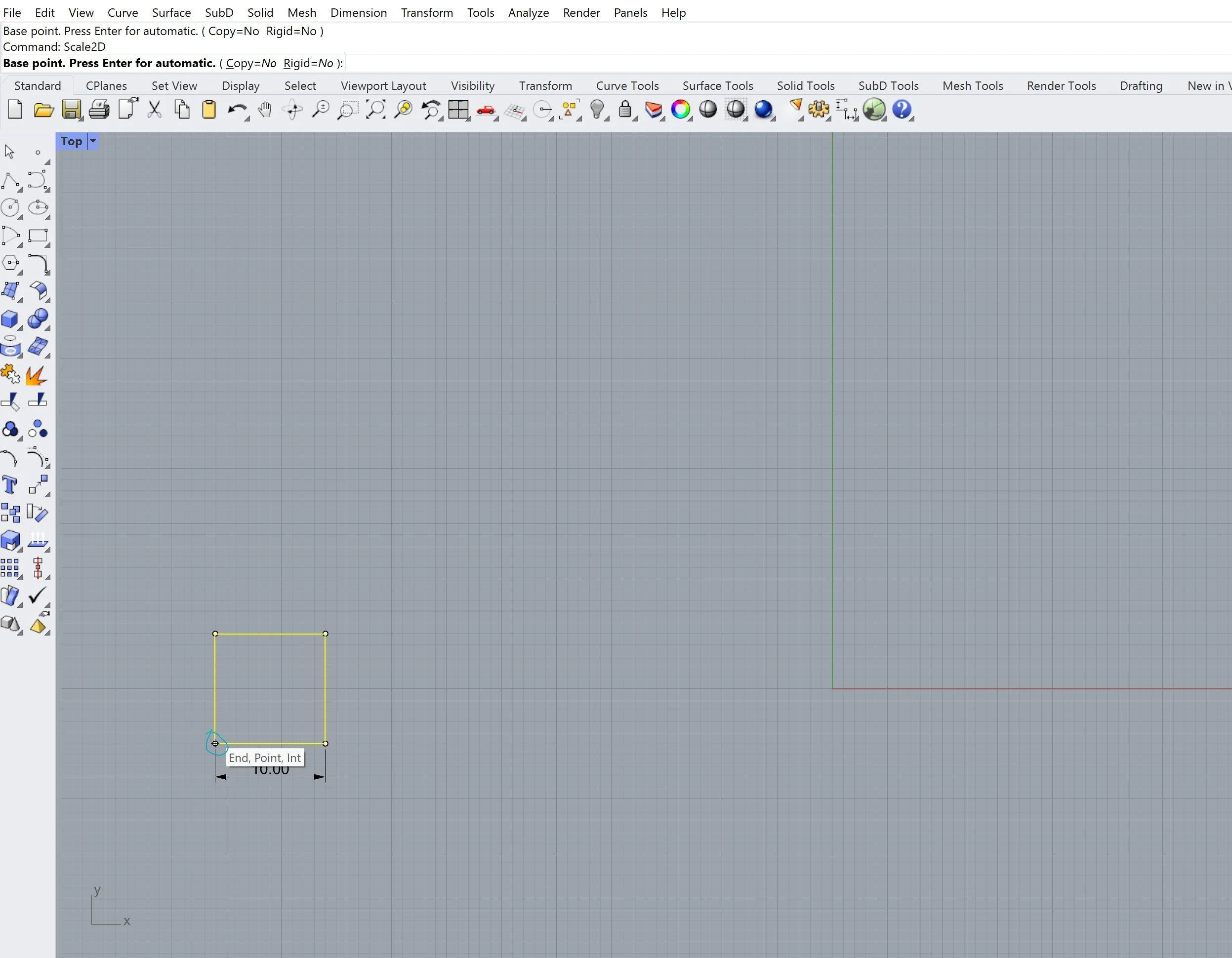 Similarly to the last method, I am starting with a square on the 2D interface that measures 10mm x 10mm [1]. I want to scale this up so the length x width becomes 50mm x 50mm. Firstly, I select the closed curve and type ‘Scale2D’ command into Rhino [7].