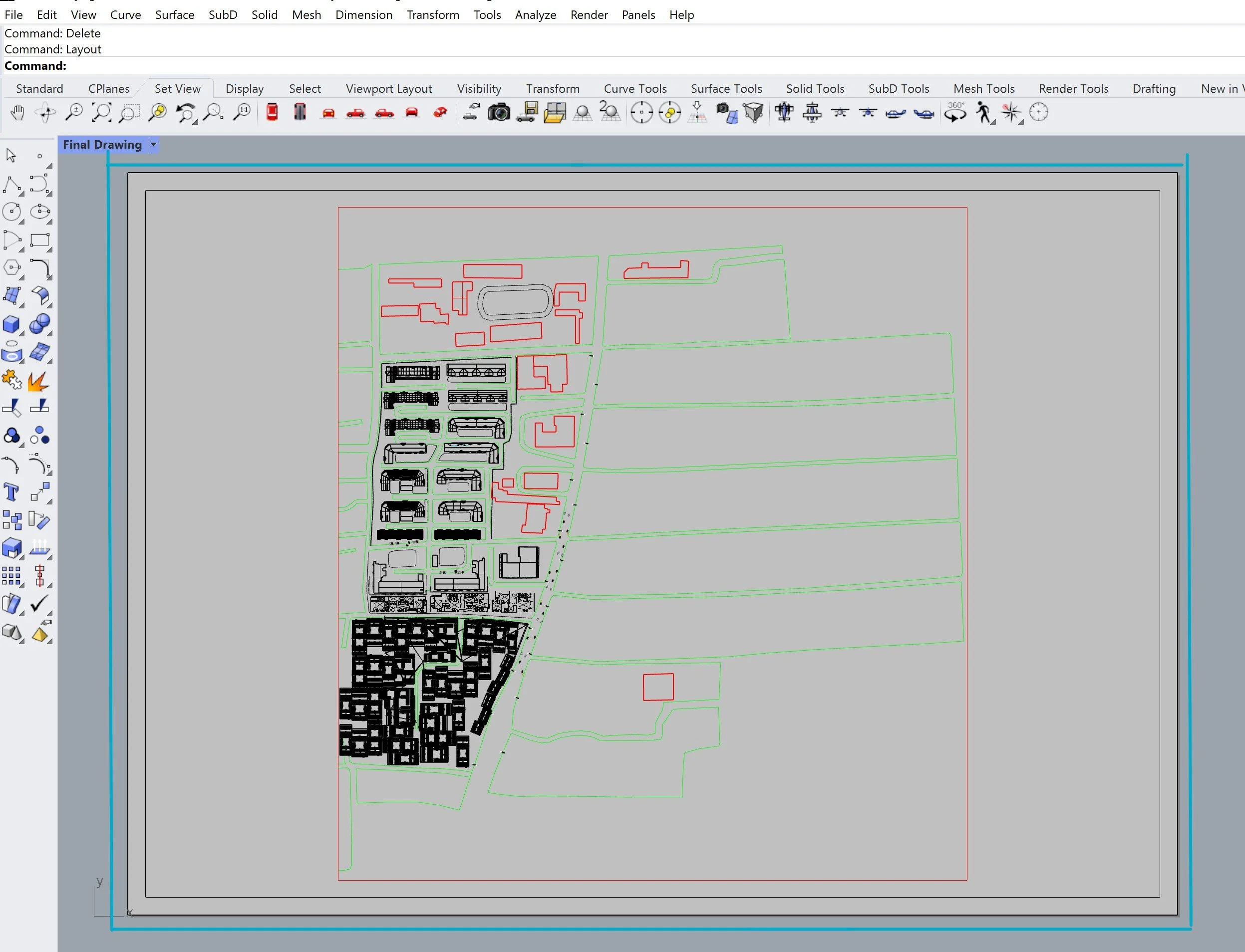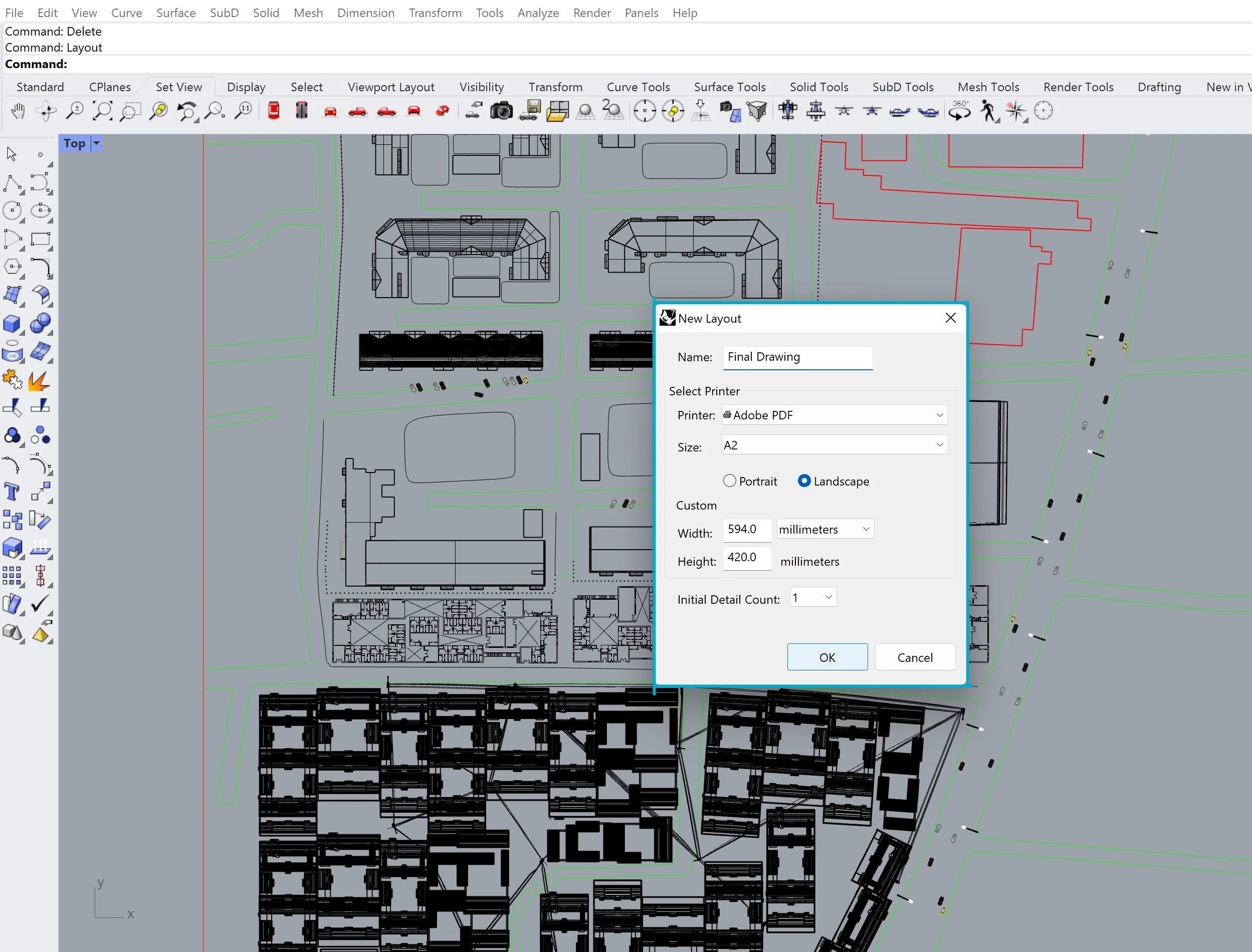 Once you’ve completed your drawing or you’ve generated a view from your 3D model, you would clean this up and go to export it out of Rhino. A very time efficient way of doing this is by creating a layout.