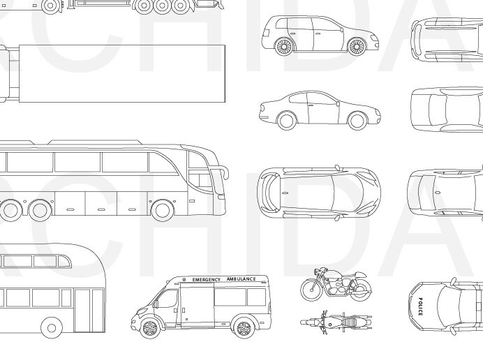 A pack of 29 vehicles in plan and elevation, ready to be added to your orthographic drawings.