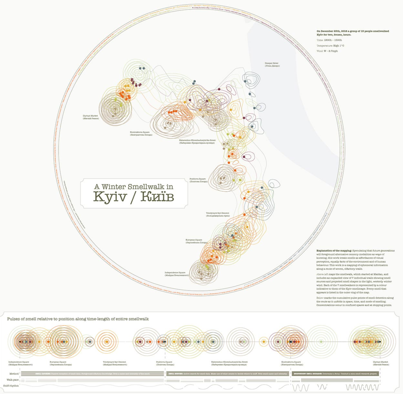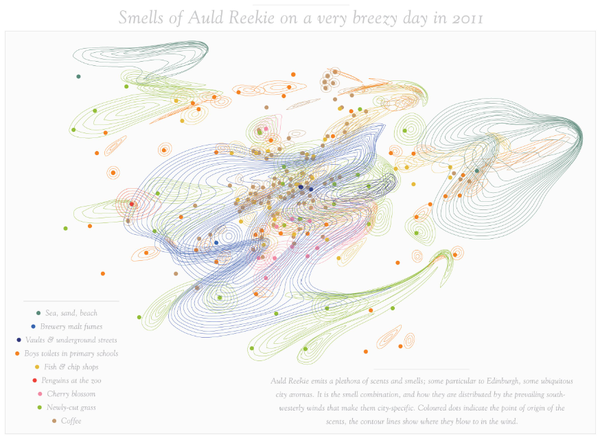 This is one of the many maps that you would generate firstly by visiting the area and recording the smells and the location of the source (i.e landfill, waste, food, nature etc.) You can then display this information, through a two-dimensional map or a three dimensional model which you present as a 2-d map. Both methods can include the location of the scent sources, the pathways which the scents will travel and the areas in which the scents will be dispersed. The map can also include information about the strength and duration of the scents, which can be shown visually through the size of circles/rings around the source. As smell is something which can disperse throughout the atmosphere, your map can look really fluid and full of movement! Here are some examples of what a noise map might look like.
